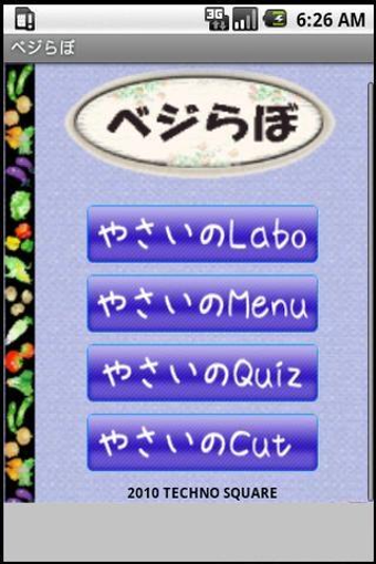 ベジらぼを開くと、4つのメニュー画面が出てきます。「やさいのLabo」「やさいのMenu」「やさいのQuiz」「やさいのCut」とあろ、それぞれ野菜の栄養価や選び方、野菜を使ったメニュー、野菜に関するクイズ、野菜のカットの仕方とその名前についての解説が載っています。